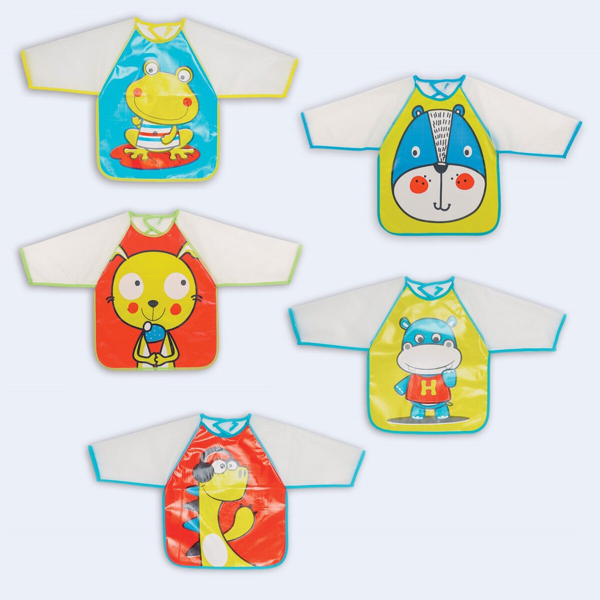 - Pack de seis baberos con mangas plastificados con dibujos variados.