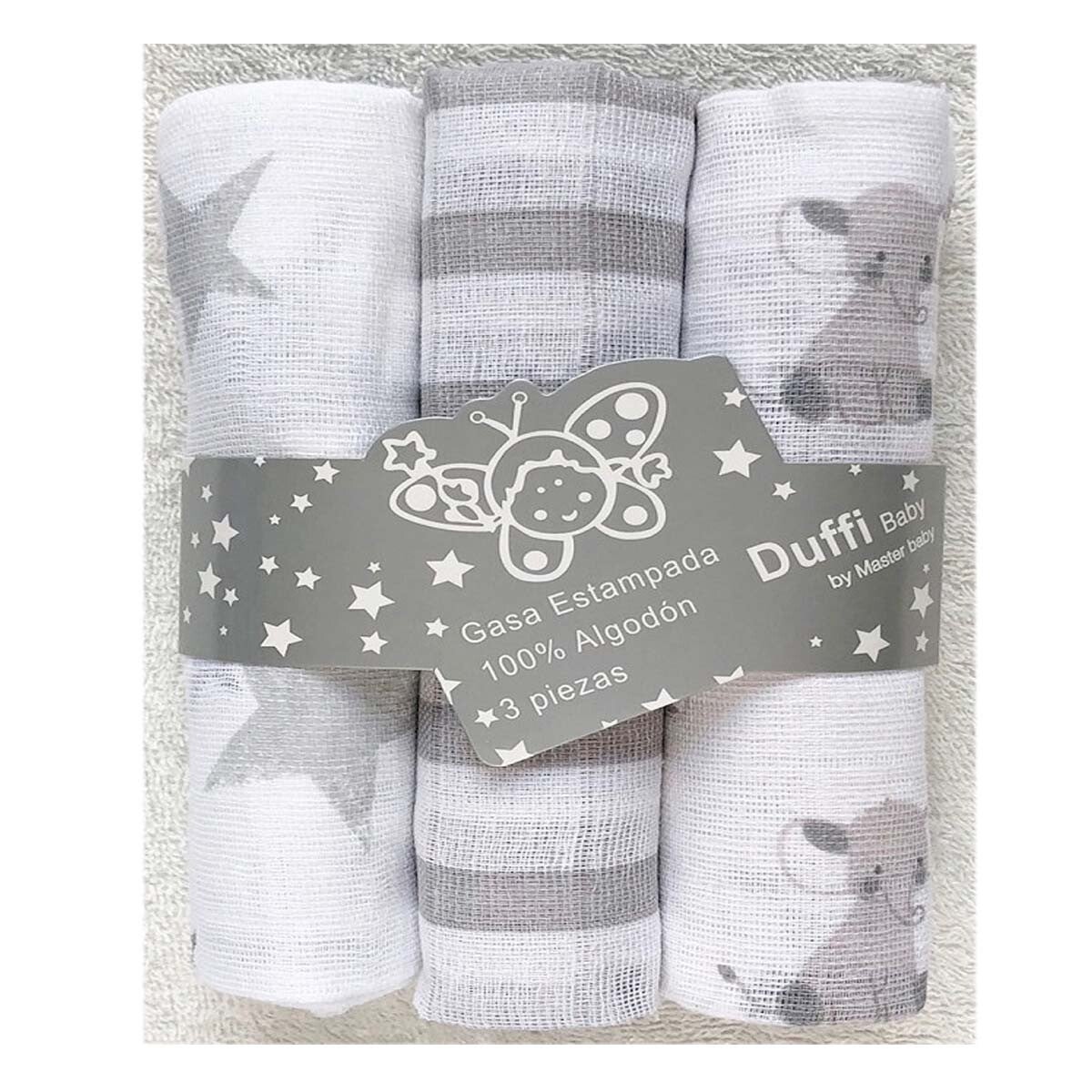 - Este set de 3 gasas de Duffi Baby, con medidas aproximadas de 80×80 cm, está disponible en una encantadora variedad de 4 colores.