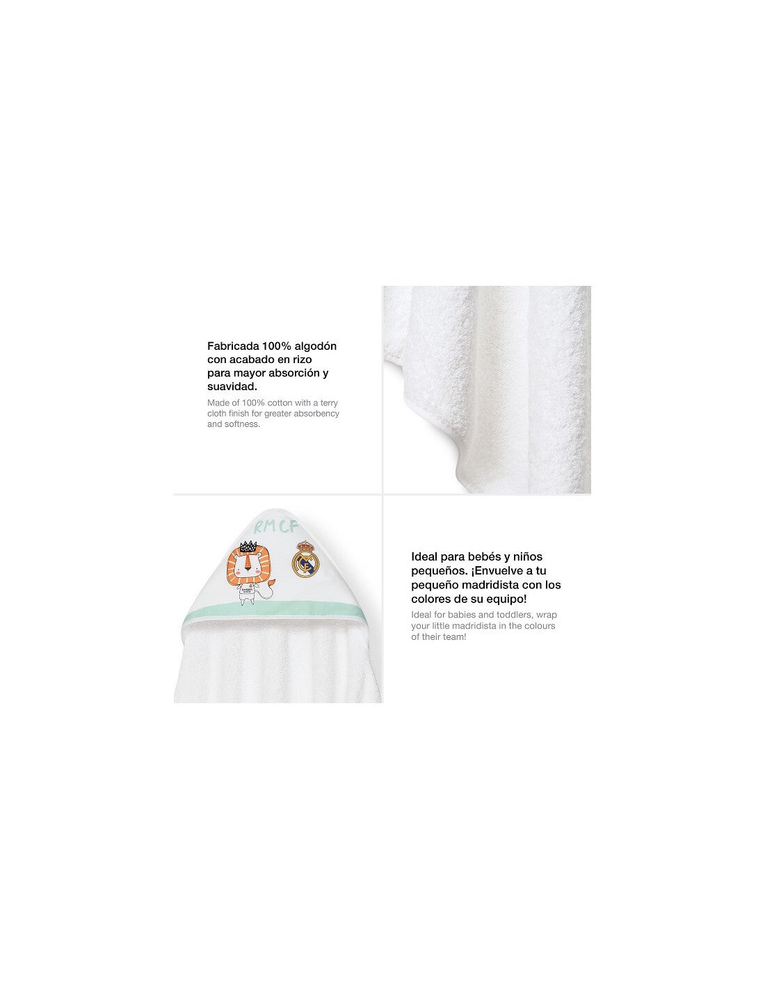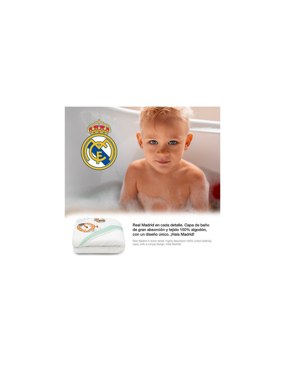- Confeccionada en 100% algodón y un diseño especial del Real Madrid, esta capa de baño es ideal para envolver a tu pequeño en suavidad y confort.