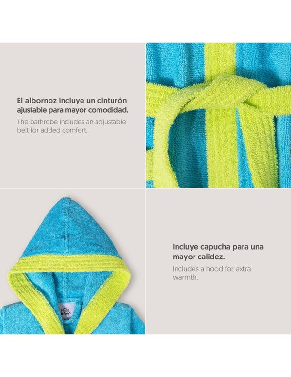 - Albornoz de rizo extra suave 100% algodón en un tonos azul y turquesa con gran capacidad de absorción
